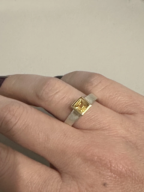 Anel em prata 925 com aro trabalhado e pedra natural de citrino com detalhes em dourado